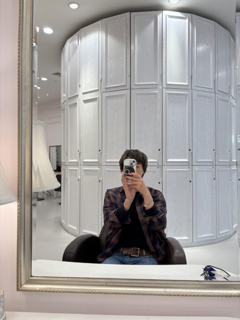 広っ!!!でか!!!奥にはVIPルームもあり、こっそり「あそこに入れるのってどうゆうひとなんですか?」ときいたら「あー、年間〇〇〇万のチケットを購入されてるお客様専用なんだ」とか。。そんな気分をすこしでも味わう為、柏木さんにヘアカットしていただきました。