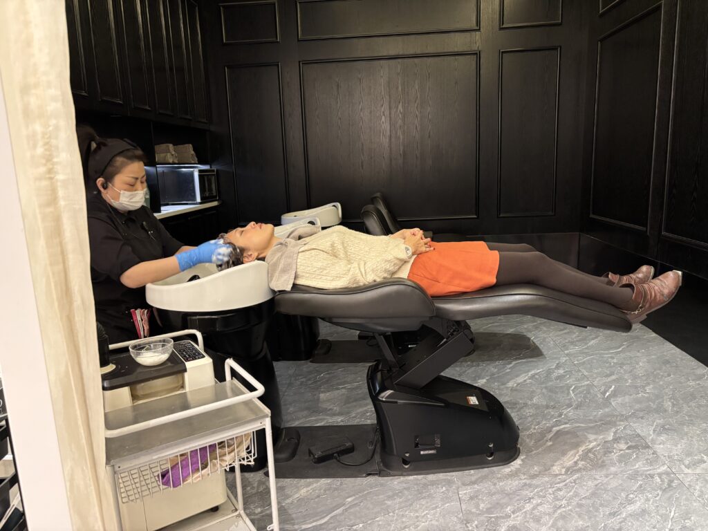 上海の美容室でシャンプーされるちゃみちゃんの図